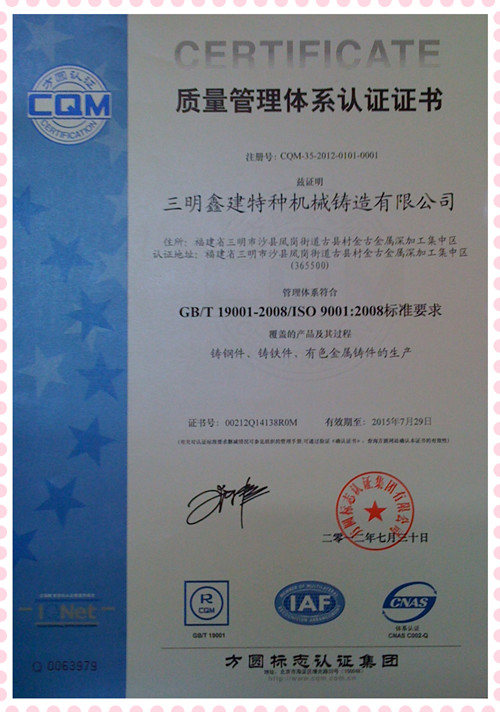 2011年,福建三明鑫建特種機械鑄造有限公司被中國化工集團公司評為優(yōu)秀供應商,此次參評的三明企業(yè)共7家企業(yè),三明鑫建特種機械鑄造有限公司是唯一獲此殊榮的企業(yè)。