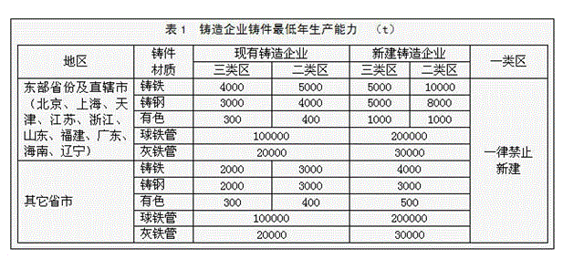 1.現有的砂型鑄鐵件(含離心鑄鐵管及其他離心鑄造)、鑄鋼件與有色鑄件生產(chǎn)企業(yè)鑄件年產(chǎn)能按所在地區(見(jiàn)表1)和類(lèi)別(一、二、三類(lèi))不同應不低于表1所列的噸位。